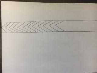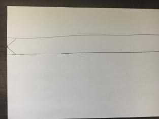 2. Bal oldalon keressétek meg a sáv közepét, jelöljétek egy ponttal, majd ettől felfele és lefele is egy-egy ferde vonalat rajzoljatok, olyat, ami eléri a vonalakat. Olyan lesz, mint egy nyíl hegye. (mutassuk)