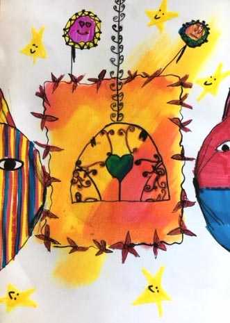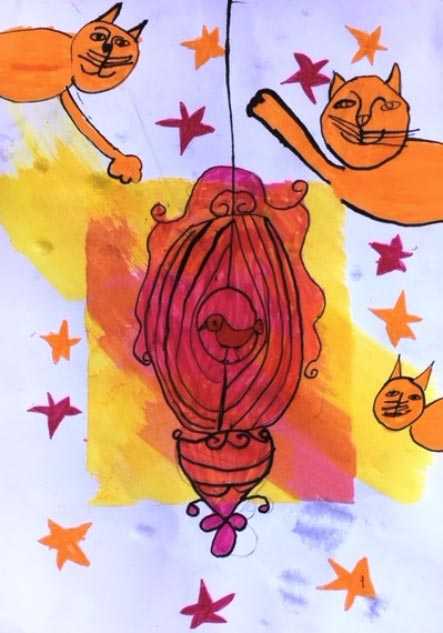- Egy előkészített rajzlapot kaptok, amin egy színfolt van. Ebbe rajzoljátok bele a kalitkát! (A rajzlapot célszerű előre megszínezni, hogy ne menjen el vele sok idő. Ha az osztálylétszám 15 fő alatt van, belefér az órába is. De ha fölötte, akkor csináljuk meg előre. Két vattagombócot készítsünk, az egyiket sárga, a másikat piros, vagy kék tussal itassuk át. Satírozó mozdulattal előbb az egyikből, aztán a másokból vigyünk fel a rajzlap közepére. Én ollóval kivágtam agy rajzlapból egy ablakot, ezt tettem rá minden rajzlapra, hogy egy kicsit pontosabban lehatárolt forma legyen, de mikor azon belül bedörzsöltem, felemeltem, és jobbra és balra kicsit kihúztam a színt, hogy ne legyen olyan merev. Kb. 8 perc alatt színeztem be húszat. Lehet persze keret nélkül is, csak középen egy szabálytalan, két színből képzett folt. Azért van rá szükség, hogy összefogja majd a kompozíciót, mert nem lesz rajta sok forma, e nélkül szétesne.)