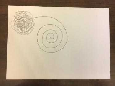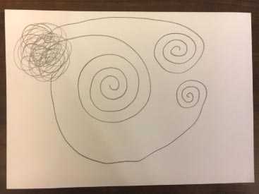 A vízszintesen tartott rajzlapotok hátuljára, a bal felső sarokba rajzoljatok egy összegubancolódott pamutgombolyagot. Firkáljatok körbe-körbe, összevissza… ezt már senki sem tudja kibogozni. Most „húzzatok ki” egy szálat, és rendezzétek úgy, hogy szép szabályos csigavonalat írjon le.