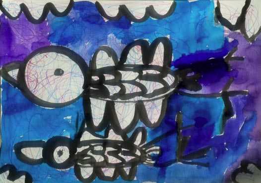 2. Először a rajzunk hátterét fogjuk elkészíteni. Ehhez fogjátok össze először két filctollat a markotokba és firkavonalakkal („füstvonalakkal”) haladjatok a rajzlapon ide-oda! Ha már ez jól megy, fogjatok hozzá még egyet, és ugyanígy firkáljatok három filctollal! Végül a negyediket is próbáljátok megfogni úgy, hogy a többivel egyszerre hagyjon nyomot. Addig firkáljátok, míg az egész felület tele nem lesz színes firka-vonalakkal!