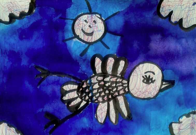 5. Egy jó nagy madarat rajzoljunk az ecsetünkkel. Előbb a fejét, majd a madár csőrét és szemét is rajzoljátok meg. Utána a testét, a szárnyait és a farktollait. Megrajzolhatjátok a lábait is. A nagyobb tollakat jelöljétek csak, a pihéket a színes firkavonalak jelölik… Ha még van hely, mert esetleg kisebb madarat festettetek, akkor rajzoljatok még mellé egy vagy akár két madarat, vagy az üres felületekre rajzolhattok felhőket az ecsetünkkel, hiszen ezek a madarak magasan a felhők között szállnak!