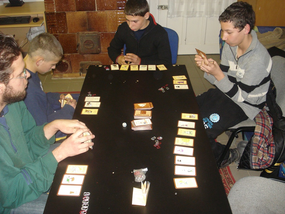 A délutáni együttlét során már a közös játéké volt a főszerep. A napközben velünk tanuló gyerekek visszajöttek, körbeültük az asztalt, és kezdetét vette egy Aranyásók-, Bohnanza-, Munchkin-, vagy Sole Mio-parti. A másik meghallgatása, a szabályok betartása és betartatása (volt, hogy megelőztek minket a fegyelmezésben), a fair play-re való törekvés alakították ki azt a kört, amit a nap elejétől fogva szerettem volna megtalálni, és végül itt sikerült rábukkannom.
