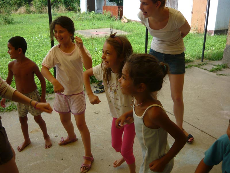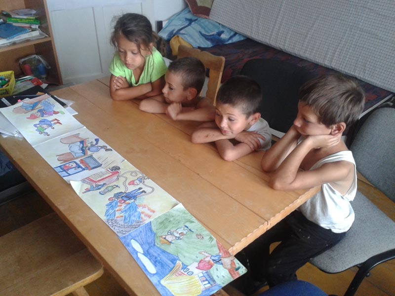 A sikeres dráma és kézműves foglalkozások miatt elmaradtak a délelőttre tervezett egyéni fejlesztések. De azért sikerült belecsempésznünk néhány fejlesztőjátékot, amiket eddig is szívesen játszottak. A délután folyamán megtartottuk a harmadik csoportos foglalkozást az iskolába készülő gyerekeknek. Átismételtünk néhány foglalkozást, pl.: tanár, szakács, tűzoltó, majd elolvastunk egy mesét. Az idő hátralévő részében a történetet dolgoztuk fel beszélgetéssel, képek időrendi sorrendbe rendezésével, néhány jelenet eljátszásával, végül mindenki lerajzolhatta a kedvenc részét a meséből. Nagyon tetszett a gyerekeknek a mese, később a pályán több önkéntesnek is beszámoltak róla.