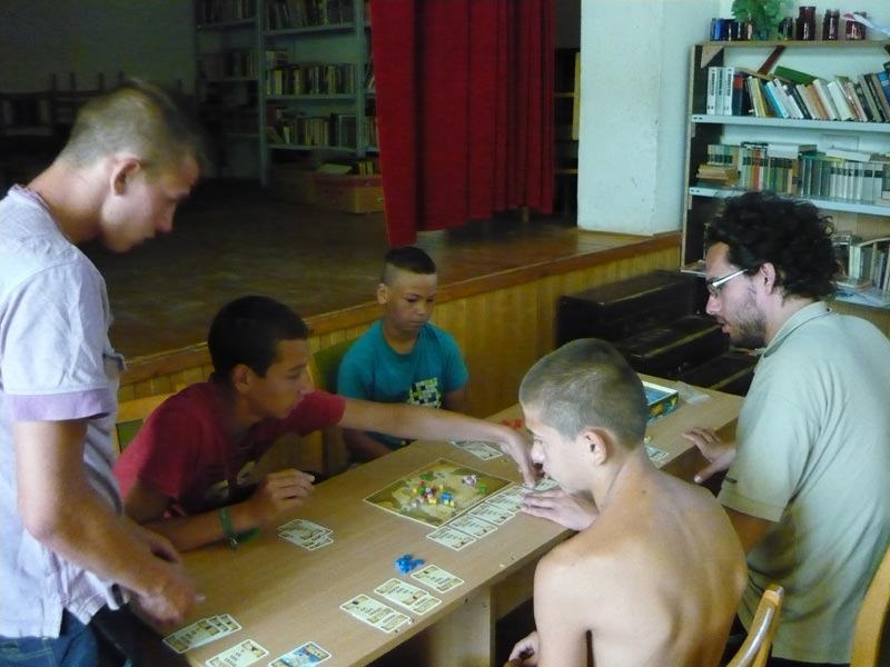 A kultúrban bemelegítésnek elővettük a No thankset, amit időnként elfelejtünk – pedig a gyerekek szeretik –, aminek valószínűleg az az oka, hogy egy elég egyszerű játékról van szó, így kevés lehetőséget látunk benne. Ez persze csak azt jelenti, hogy meg kellene találni a helyét: bemelegítés, átkötés, hasonló mechanizmusok bevezetése. A mai napon tökéletes ráhangolódásnak bizonyult. A nap új játéka a Nyolc perces birodalom volt, ami egy gyors, egyszerű területfoglalós társas. Ezek a tulajdonságai teszik alkalmassá arra, hogy komplex játékokat készítsünk elő vele, illetve hogy kevésbé gyakorlott játékosokkal megismertessük ezt a világot, lehetőséget teremtsünk a bevonódásra. Szerencsére azok is élvezték, akik a bonyolultabb játékokkal is jóban vannak.