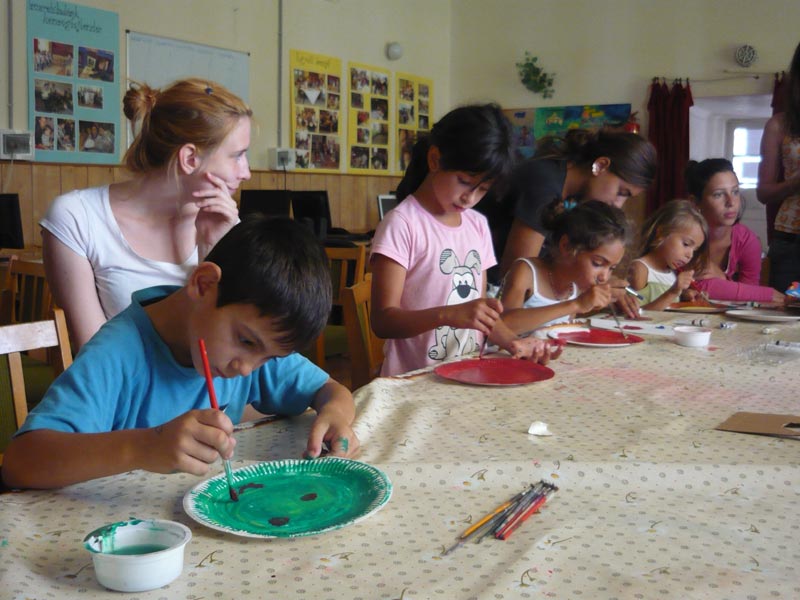 A kézműves foglalkozásra most több játékötletet is vittünk, és a legtöbben nem is elégedtek meg egyféle elkészítésével. Csináltunk pörgettyűket, ütőket egy lufipasszolgatós játékhoz, és egy egyszemélyes ügyességi játékot is. Nagyon jó volt látni a gyerekek lelkesedését, és hogy a kicsik is hosszasan, nagy odafigyeléssel dolgoztak egy-egy eszköz elkészítésén – a nagyok pedig maguktól ajánlottak segítséget nekik a nehezebb részeknél. Sokan egészen délig rajzoltak, festettek, vágtak és ragasztottak, aztán pedig az új játékokat próbálgatva, nagy lufipukkasztgatások közepette mentek haza ebédelni.
