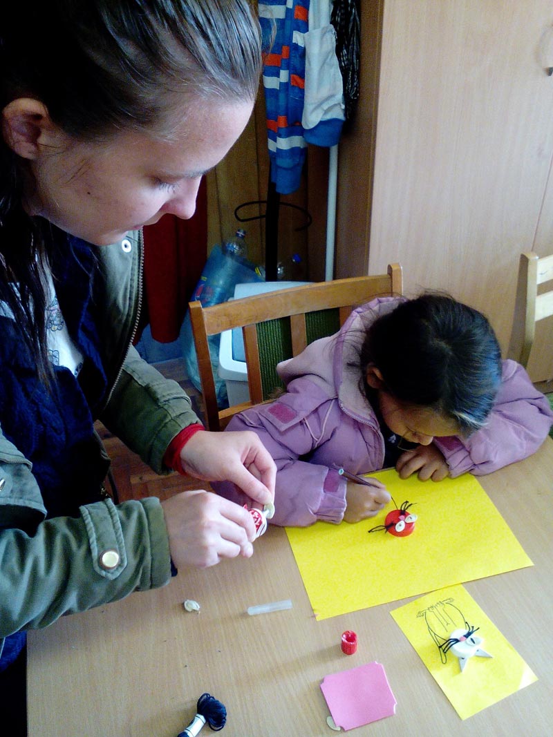 A hűvös idő miatt délelőttre és délutánra is készültünk kézműves foglalkozással. Délelőtt kupakokból varázsoltunk különböző állatokat. Készültek bolondos pókok, aranyos cicák, sőt az egyik kisfiú a saját kutyáját is elkészítette.