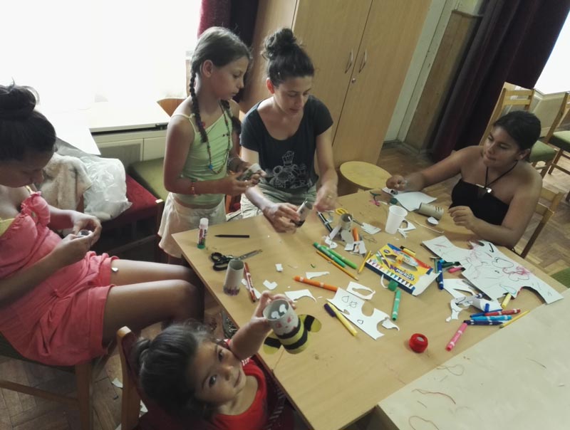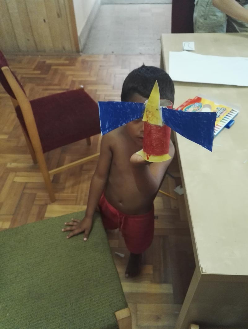 A mai kézművesen papírgurigákból méhecskéket készítettünk. Szárnyaikat egy ügyes technikával mozgathatóvá is tettük: ha egy kis zsinórt húzogatunk, akkor olyan, mintha repülnének a méheink. A guriga kidíszítése, az arc megrajzolása, szárnyak kivágása mindenkinek megfelelő feladat volt, de a szárnyak összefűzését az önkéntesek csinálták. A feladat könnyen alakítható volt, páran inkább vadászrepülőt készítettek! Minden elkészült darab nagyon szép és egyedi lett!