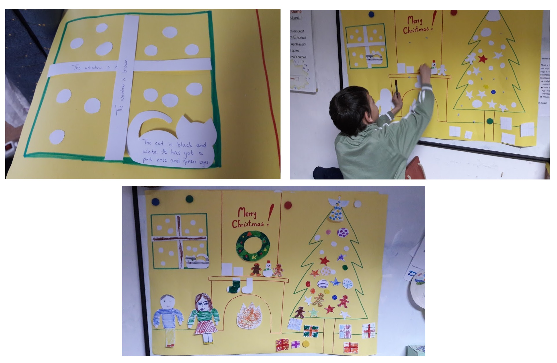 Karácsony előtt egy különálló egy hetes projektet is elindítottunk, ami egy-egy egyéni foglalkozást fedett le. Egy plakát részeit kellett kiszínezni az alapján, hogy az egyes részek hátuljára milyen utasításokat írtunk. Célunk volt, hogy ezzel a kézművesebb projekttel szerethetőbbé és érdekesebbé tegyük az idegen nyelvet a tanodásaink számára. Itt nagyobb lehetőségünk volt a differenciálásra is, ezért minden gyereknek saját listát készítettünk arról, hogy pontosan melyik figurákat kell kidíszítenie a plakáton. A figurák közül a kezdők az egészen egyszerű utasításúakat kapták, a haladóknak pedig hosszabb és bonyolultabb szövegeket írtunk. A gyerekek közül majdnem mindenki kiszínezte a rá eső részt, így egy közösen kidíszített plakátot kaptunk végeredményül karácsonyra.