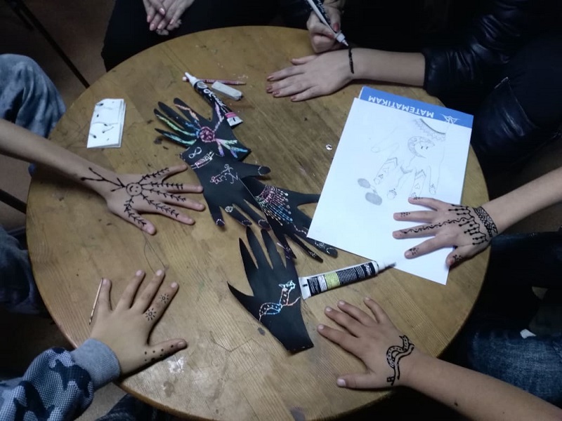 Nem ez volt a legjobban sikerül projekthetünk, de volt egy nagyon szép hozadéka. Vagy legalábbis megmutatott valamit, amiben fejlődik a tanodás csapatunk. Már a ráhangolódó gyakorlatunk, a madzagrajz is jó hangulatban, a csapatot összehozósan telt, de a szombat nagyobb, 8-10 fős csoportjai kifejezetten közösségi érzetet keltettek. És ez már nem csak azt jelenti, hogy nem volt konfliktus, hanem azt is, hogy együtt mozogtak, együtt voltak jelen, kapcsolódtak egymáshoz. Nagyjából végig és szinte mindenki. Türelmesen vártak a sorukra, beszélgettek, nézték egymás motívumait, tervezgettek. A nagyobb lányok beálltak hennázni és nem csak a barátok, tesók kerültek a kezük alá, hanem olyan párokat is láttunk, amiket máskor nem igazán. Aztán a hennának száradnia is kell, ami aztán igazán egy felesleges, hülye dolog, mert mit lehet közben csinálni? Kiderült: beszélgetni, nevetgélni, hennás, street artos videókat nézni.