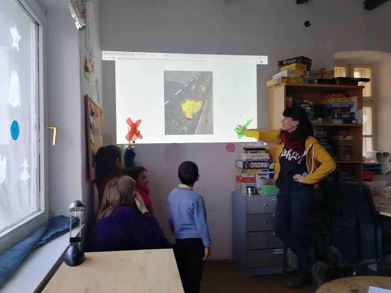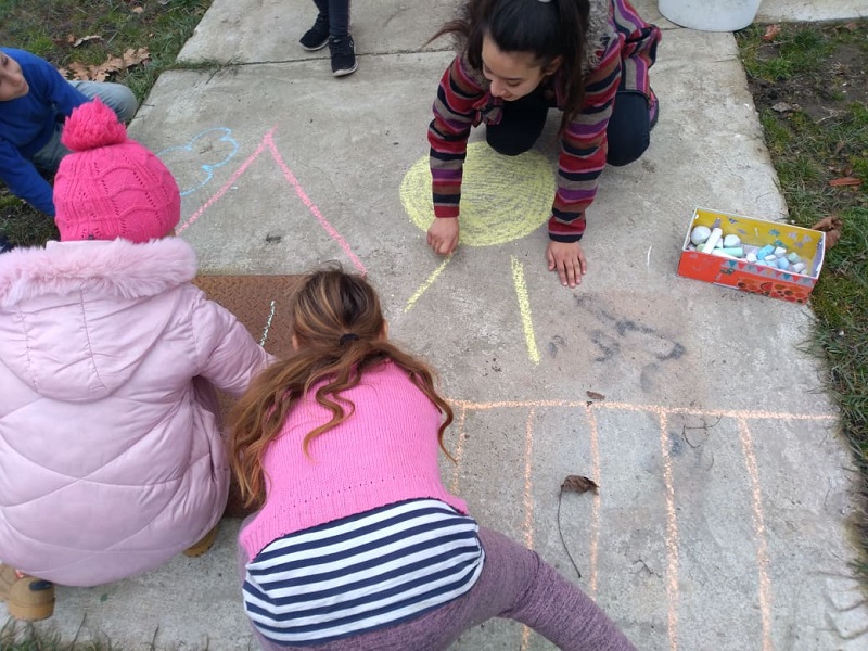 A henna mellett színesítésként volt egy kis street art is: képek és videó nézegetése után a kertben keresgéltünk helyeket, amiket egy kis kreativitással és krétával fel lehetne dobni. Sajnos a példák túl erősek voltak és nem igazán tudtak túllépni rajtuk, ugyanakkor sokaknak tetszett ez a világ, később, a foglalkoások során talán építhetünk majd rá témaként. A projektben viszont zárójelben maradt, kicsit oda nem illő izéként, pedig elsőre logikusnak tűnt a kapcsolása.