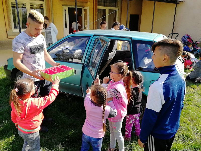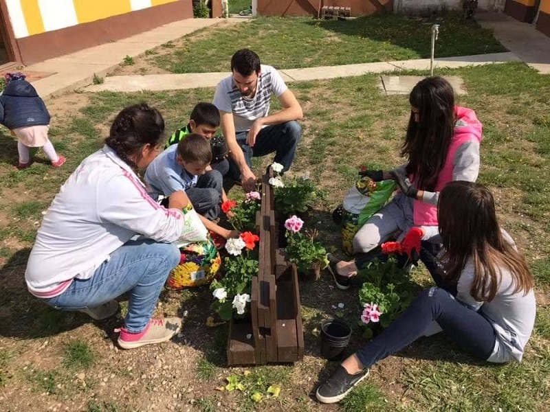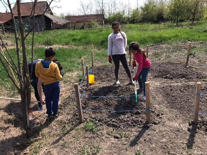 A környezetvédelem témából természetesen nem maradhatott ki a növényültetés sem. Kisebb csoportokban dolgoztunk, hogy mindenki aktívan részt tudjon venni. Az egyik feladat muskátli ültetés volt, előre elkészített faládákba rakták a gyerekek a virágokat. Ki kézzel, ki kanállal pakolta a virágföldet, de mindenki nagyon lelkesen dolgozott, láthatóan senkinek nem okozott gondot egy kis dagonyázás a társasozás után. Miután minden virág bekerült a földbe, lelkiismeretesen meg is öntözték őket – sokaknak ez volt a kedvenc része. A virágültetés után minden csoportnak volt még feladata. Az első csoport műanyagkupakokból készített kis virágokat, amiket aztán a következő csapatok használtak a veteményeskertben a zöldségek jelölésére. A második csoport vörös- és lilahagymát ültetett, a harmadik retket, a negyedik borsót és babot. A gyerekek a föld felkapálásától kezdve a magok elszórásán és betemetésén át mindent ügyesen végigcsináltak, természetesen itt sem maradhatott el a végén az öntözés, és végül a kis jelző virágok is bekerültek a földbe.
