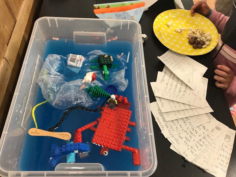 Autós szemeteléssel és az ökológiai lábnyomunkkal foglalkozott az egyik csoport. Az uzsonna után keletkező szemétnek eddig nem volt külön helye a kocsiban, ezért azt találtuk ki, hogy készítünk egy kukát, amiben az ülés alatt, szelektíven gyűjthetjük majd hazafelé is a hulladékot. A ötletet leginkább egy ötödikes fiú érezte magáénak, ő irányította végig a gyártást és a kipróbálást is, a többiek pedig be-besegítettek a folyamatba. A tesztelésről egyébként egy gyorsított felvétel is készült, jelentjük, egyelőre jól bírja a strapát! Az ökológiai lábnyom főként a kézműves miatt tetszett meg néhány csoporttagnak az ötleteléskor. Velük egy kérdőívet töltöttünk ki először, ennek az eredménye került fel egy-egy plakátra kis rajzok formájában. A kitöltés sok segítséget igényelt, messzi és eléggé elvont volt a téma számukra, de jó volt kicsit beszélgetni róla alkotás közben is. A feldolgozást egy autós kiállítással zártuk ma: a vadiúj szemetesünknél a tesztelésről nézhettek meg egy gyorsított videót a látogatók, míg a plakátoknál a saját ökológiai lábnyomukat is megmérhették a többiek. Eltérő intenzitással bár, de összességében öt gyerek dolgozott ezen a projekten.