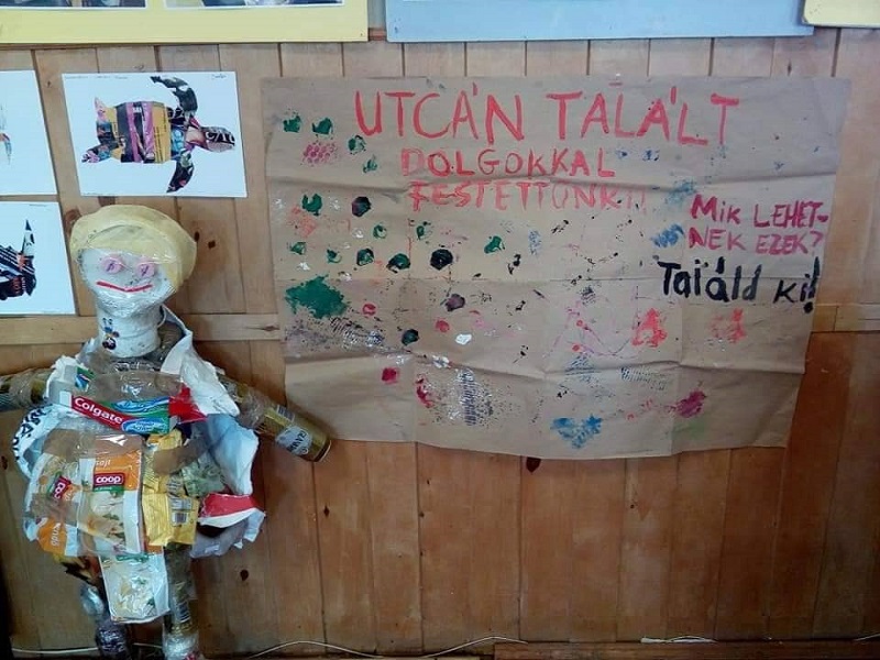 A tervezetthez képest elég kevesen voltunk a hatodik csoportban, de persze így is elkezdtük az ötletelést, miközben egyre kíváncsibbak lettek a gyerekek. Végül két ötletet vontunk össze: hulladék anyagokkal festünk és készítünk egy tablót, amin tippeket adunk, hogyan lehet valaki környezetbarátabb. Hét javaslat össze is gyűlt, elkezdtük a felírást, rajzolást, de ez a plakát végül nem készült el. A festést kicsit továbbgondoltuk, jártunk egy kört a faluban, és összeszedtünk sok mindent, amivel festeni tudnánk, természetes anyagokat, és kevésbé a természetbe illőket is. Ez a rész nagyon bepörgette a gyerekeket, úgyhogy festettünk velük és végül ez került a kiállításra is. A közönség pedig találgathatott, mivel készültek a minták.