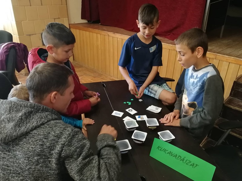 Például elkészült a Kukavadászat című társasjátékunk is. Nem először terveztünk együtt játékot a gyerekekkel, de eddig ez sikerült a legjobban, így valószínűleg nem is ez volt az utolsó alkalom. Az ötletelés során hamar meglett a téma: szelektív hulladékgyűjtés. Ez volt az egész hónapban a legerősebb, ezt értették meg az egyik legjobban. Gyorsan jöttek az ötletek: legyenek kukák, válogatni kell, tudni kell, mit hova lehet dobni, az nyer aki a legtöbb szemetet dobja ki. Az is hamar kiderült, hogy rövid játékot szeretnének. A mechanizmusok során volt pár lapos kör, de egy erősebb irányítás mellett egy valóban érdekes játékmenet alakult ki. A játékot 3, 4 és 5 fővel próbáltuk és egyértelműen négyen a legjobb, a játékidő 5-10 perc és 6 éves kortól bőven játszható, bár szavakat kell benne olvasni. A játéktér közepére kiteszünk 5 kukát (papír, műanyag, fém, üveg, vegyes), amit újrahasznosított pudingos dobozokból csináltunk, majd mindenki kap a saját színében 15 szemetet szimbolizáló jelölőt – mi dekorgumi maradékokat használtunk. Ezután megkeverjük a szemétpaklit, melynek egyik oldalán valamilyen szemét található (pl. konzervdoboz), a másik oldalán a kategóriája (pl. fém). A játék addig tart, amíg el nem fogy a pakli, ami most 30 lap volt. Minden körben a kezdőjátékos felcsap a játékosok számával megegyező kártyát a szemét felével, majd ő kezdi a licitálást: a saját jelölőiből bármennyit feltesz egy szemétre vagy passzol. A következő játékosok tehetnek arra is, amire más már tett, de akkor felül kell licitálniuk. Ha mindenki volt már akkor a körnek vége és megnézzük ki melyik szemetet nyerte. Aki alulmarad a licitben az visszakapja a jelolőit. Aki nyer annak meg kell mondania, hogy adott szemét melyik kukába való. Ha eltalálta, akkor azokat a jelölőt, amikkel megnyerte a licitet, be kell dobnia a megfelelő kukába. Ha téved – a kártya megfordításával ellenőrzünk -, akkor a jelölői elvesztek, nem teheti őket egyik kukába se. A játék végén megnézzük, hogy melyik kukában kinek van a legtöbb jelölője. Döntetlen esetén senki sem szerzi meg a kukát. Aki a legtöbb kukát szerezte, az a győztes. Egyenlőség esetén az, aki kevesebb jelölőt használt a győztes kuká(i)hoz. A játékot pedagógusok, önkéntesek és gyerekek tesztelték, majd a bemutató során újabb partikra került sor, például egy apuka is kipróbálta. A srácok szerették ezt a munkát, valószínűleg foglalkozunk még vele: dizájn, doboz, szabályfinomítások. Persze ha valaki meg akarja venni a gyártási és forgalmazási jogokat, akkor szívesen leülünk tárgyalni vele.