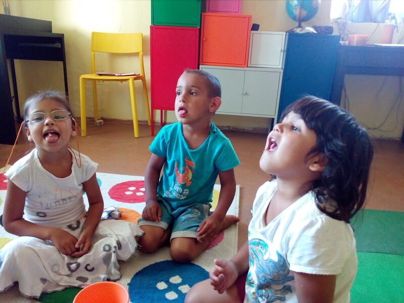 Volt lehetőségünk beszédfejlesztő feladatok kipróbálására is. A cél az volt, hogy a legkisebbek is megismerkedjenek a logopédiával. Különböző állatokká varázsolva magunkat, utánoztuk az állathangokat. Ezután a nyelvünket tornáztattuk meg. Előkerült a zizi és még építőelemeket is egyensúlyoztunk az ajkaink között lévő spatulán. A zörej felismerésnél nagyon füleltek a gyerekek, hogy kitalálják az ollót csattogtatjuk, vagy a zacskót zörgetjük. Végül buborékfújással zártuk a foglalkozást. Aki épp nem fújt, neki különböző testrésszel (ujjal, térddel) kellett kipukkasztania a bubikat.