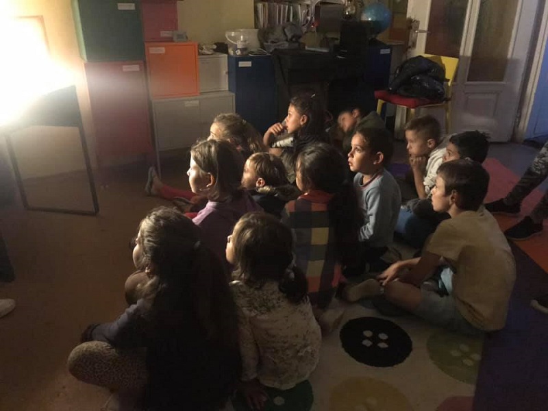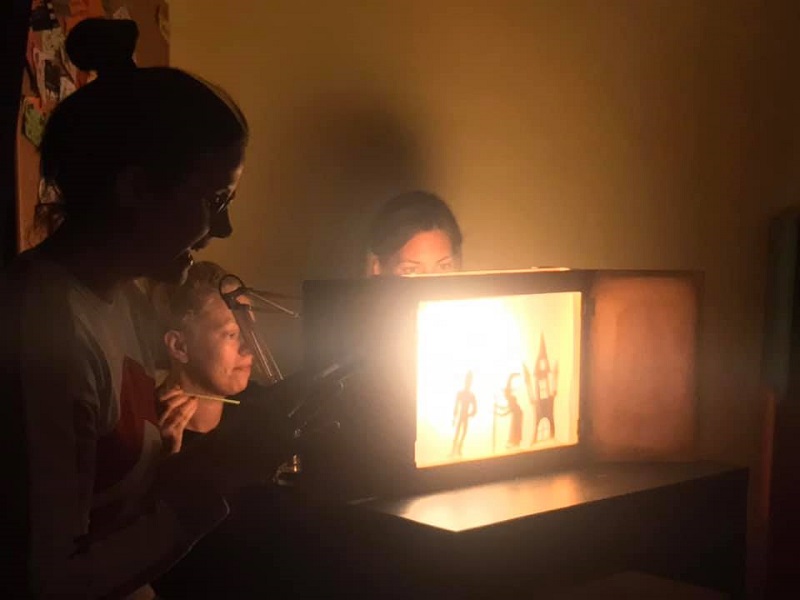 A korai sötétedésre való tekintettel egy árnyszínházzal is készültünk a gyerekeknek. A mesét természetesen Halloweenhez választottuk, A banya című népmesét elevenítettük meg bábozva. Sniccerrel igyekeztünk minél kifejezőbb figurákat vágni, zsírpapírt erősítettünk a nyári táborokban oly népszerű papírszínházas keretre, és egy lámpával megvilágítva előadtuk a történetet. A gyerekek átszellemülve nézték végig, majd ők is betekintettek a kulisszák mögé.