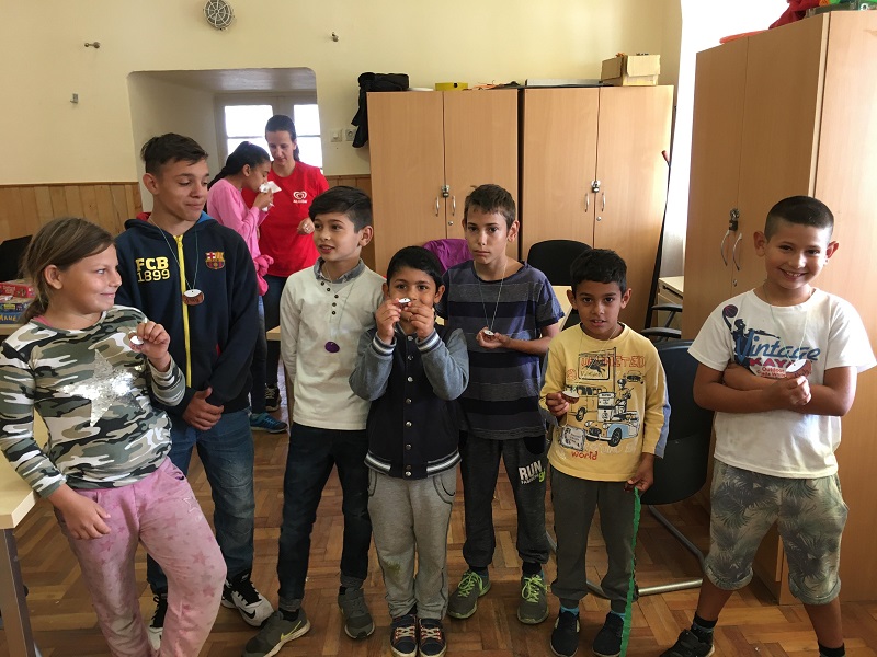 Az utóbbi két évben hiányzott az őszi táborokból, de idén egy kis gesztenyeszedési összefogásnak köszönhetően újra megtartottuk a Toldi Gesztenyeolimipiát. Az olimpia első része a röptető elkészítése volt gesztenyéből és krepp papírból, ezután kezdődhetett csak az igazi megmérettetés. A versenyen az alsósok és felsősök külön versenyeztek 4 versenyszámban: célbadobás földön levő karikába, célba dobás levegőben tartott karikába, távolra dobás és szépségdobás. Valószínűleg most volt a legtöbb résztvevő, mert eddig, ha az emlékeink nem csalnak, sose kellett párhuzamosan tartani a versenyszámokat a várakozási idő csökkentése végett. De a várakozások ellenére minden gyerek benne maradt a versenyben és nagyon élvezték is, szóval örülünk, hogy újra sort tudtunk erre keríteni. Persze a végén az érmek és díjátadó sem maradt el, a büszke nyertesek a képen láthatók.