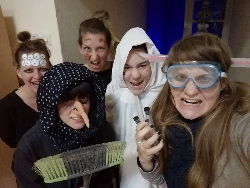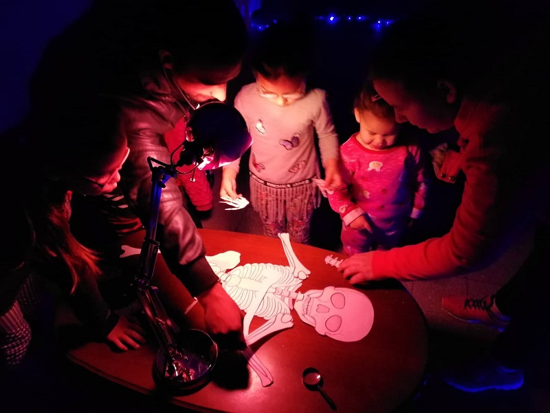 A nagy készülődésben egyszer csak eljött végre a Halloween ideje is. Egy zombi, egy szellem, egy óriáspók és egy boszorkány mellett maga Frankenstein is ellátogatott a kultúrba egy estére, hogy kicsit megijessze, kicsit elborzassza, de leginkább szórakoztassa a gyerekeket. A zombinál és a póknál olyan ügyességi próbákat kellett teljesíteni, mint a pók futtatás, pókfonálról pillecukor evés vagy célbalövés szemgolyó katapulttal. A szellemnél a tapintás volt a középpontban, itt csótányokat, pókokat, agyat és egyéb nyalánkságokat kellett felismerni. A boszinál mindenki saját bájitalt keverhetett különleges hozzávalókból, például bibircsókból és egérürülékből, Frankenstein pedig megpróbálta életre kelteni a szörnyét – sajnos ez alkalommal sikertelenül. Mivel a Halloweenra nem csak a tanodásokat, hanem kis- és nagytestvéreket, szülőket is vártunk, két este három csoportban, öt állomáson zajlottak egyszerre az események. Rengetegen jöttek el, többször is az egész család elkísérte a legkisebbeket, így összesen több, mint 60 gyerekkel és szülővel ünnepeltünk együtt idén.