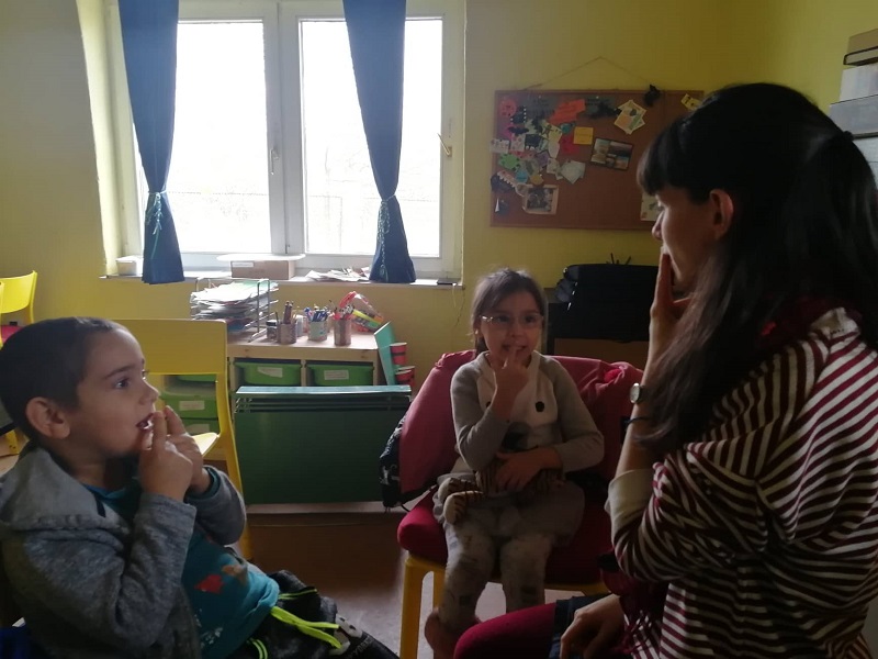 De a megvilágosodásunk után újrakezdtük. A foglalkozásokat minden gyerekekkel közösen indítjuk, ilyenkor mondókázunk és énekelünk. Célunk lett még az is, hogy ebben a kezdőkörben tanuljuk az egymásra figyelést, a testrészeink helyét és funkcióját. És szép lassan közelítsünk mondókáktól a meséig, rövid mesétől a hosszú meséig, fejből elmondott, eszközigényes mesétől a könyvből olvasott meséig. Persze, ez még jó messze van, de most már úgy gondoljuk, az irány legalább jó. Két csapatban vannak a gyerekek, a csütörtökieknél nagyon jól működik már a kezdőkör, ugyan csak ketten vannak, de igazán nagy boldogság ezeken az alkalmakon rész venni. A pénteki csapattal még alakulunk, néha gördülékeny és szuperül megy, máskor pedig minden feladatnál újra kell kezdenünk a bevonódást, de itt láttuk az egyik legnagyobb előrelépést : az egyik kislány év elején a többiektől távol, a helyzetből teljesen kivonva magát, nem igazán vett részt aktívan, de most már beül a körbe és a feladatok többségében részt is vesz. Szóval bizakodóak vagyunk, hogy lassan, de alakulni fog.
