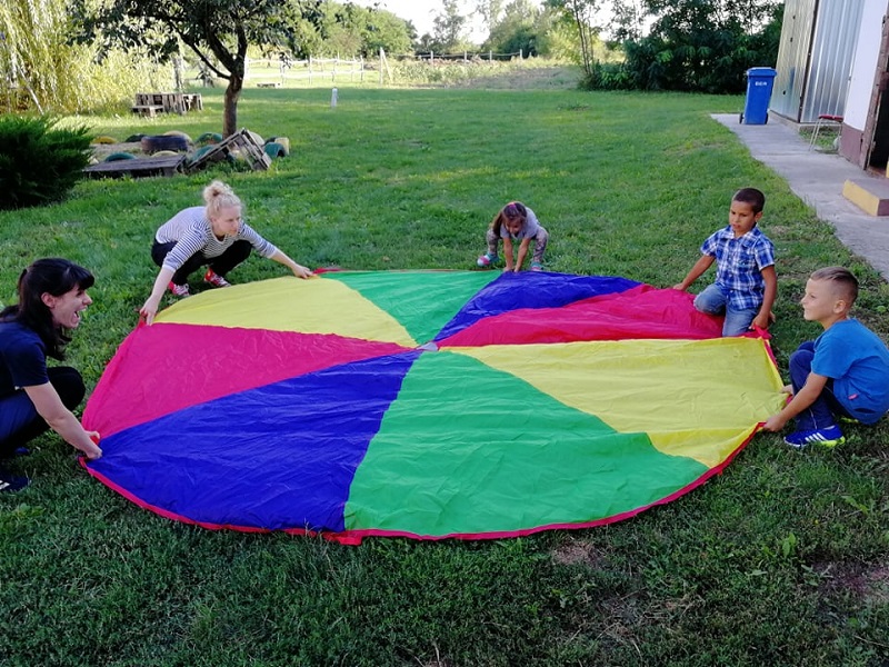 Bár kerüljük a csoportos helyzeteket, a kézmosás és lázmérés után egy élménypedagógiás ernyő biztosította számunkra a megfelelő távolságot, amivel a tanév során egy csapatba járókkal közösen oldottunk meg néhány feladatot.