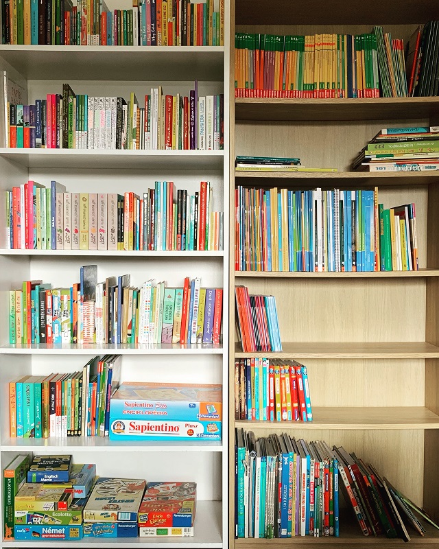 Nem is kell visszafordulni, mehetünk tovább, az újabb ajtó mögött a legnagyobb szobánk található, ahol szintén van lehetőség két íróasztalhoz elvonulni, de csodásan lehet középen csoportosulni és igazán látványosan elférnek a társasjátékaink és könyveink is.