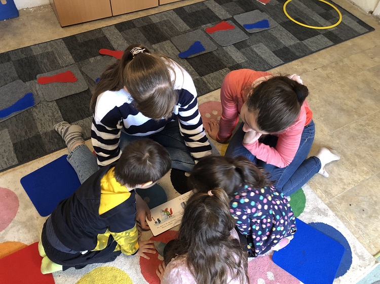 Bár még egy hetünk hátra van a márciusból, de azért a nagyrészét már magunk mögött tudhatjuk. Eredeti terveinket kicsit átszabták a betegségek, kirándulások, de még így is négy alkalmat sikerült végigvinni. A közös résznél jól bevált a Mozgáskottás kezdés, így ebben a hónapban sem akartuk ezt szüneteltetni. Csipp-csöpp ritmust mondogatva ugráltunk végig a kék úton, ahol a tél utolsó morzsáit (babzsákjait) szedtük össze, majd páros lábon vagy szökdelve jutottunk át a zöldmezős útra, ahol csip-csiripre ugrálva a tavasz is megérkezett közénk. Zöld babzsákokból mezőt készítettünk, amelyre színes babzsák virágokat ültettünk, múlt héten pedig már rovarok is szálltak rá. A Mozgáskottás részt egy mondókával zártuk, majd még Rotraut Susanne Berner Tavaszi böngészőjéből néztünk meg egy-egy oldalt közösen.