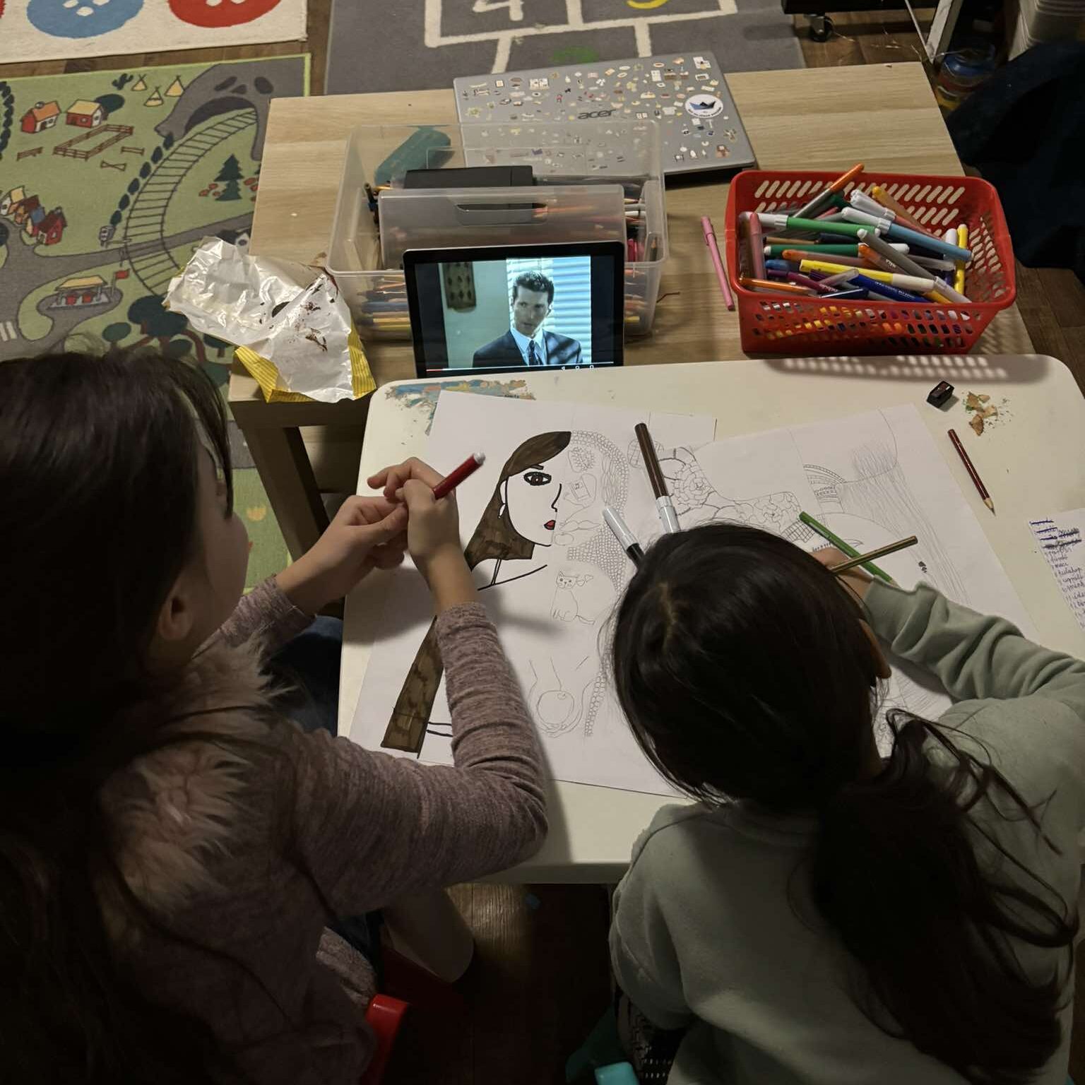 Lányok… Pro: folytatták a rajzot szabadidejükben is. Még egy Pro: nem maradtak le a délutáni sorozatról sem..