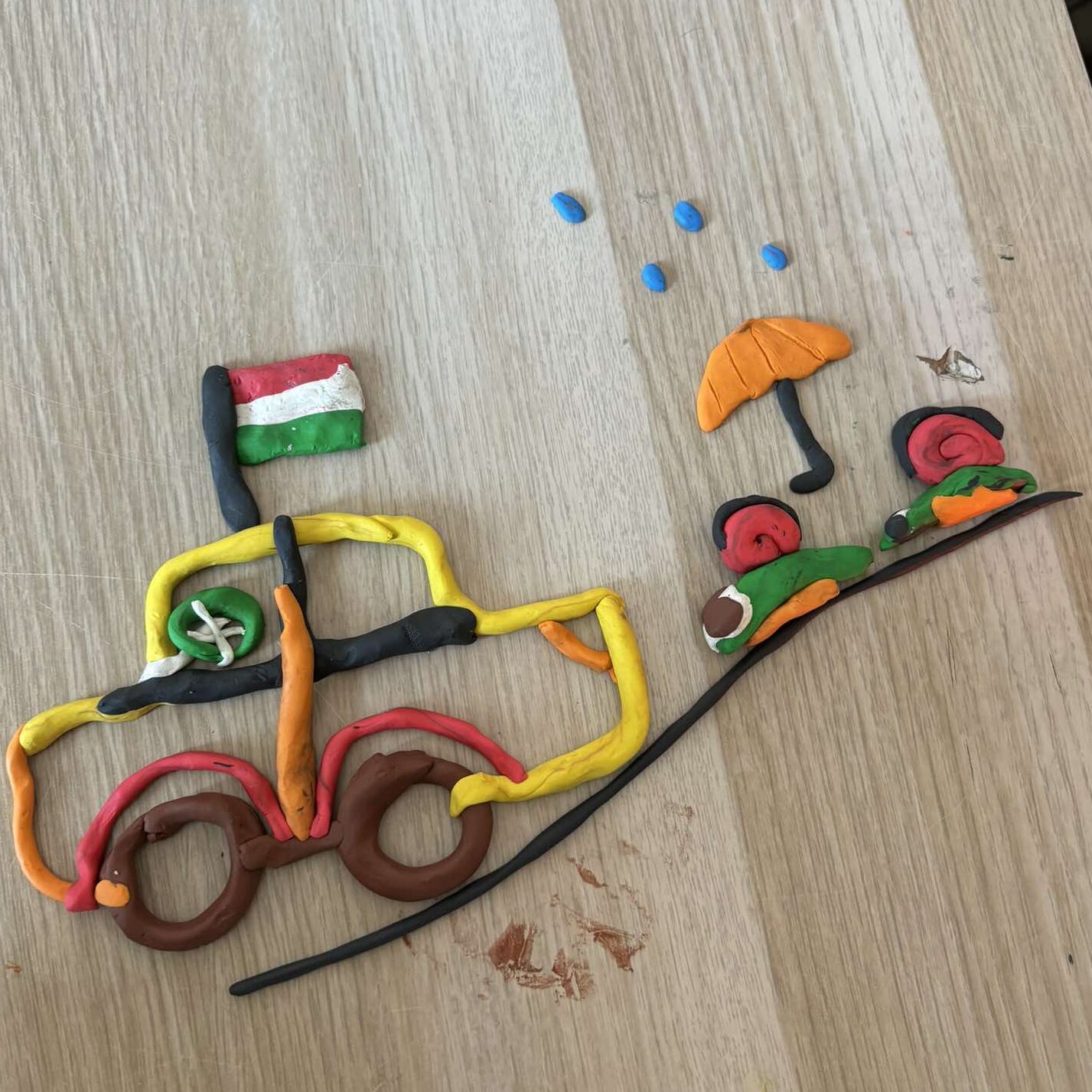 Kiraktuk gyurmából az ovis jeleinket, aztán egy montázst készítettünk belőlük! (autó, csiga, esernyő, zászló)